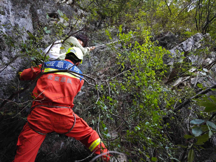 救援人员利用绳索护送被困人员缓慢下山盛鹏智投。怀柔消防供图